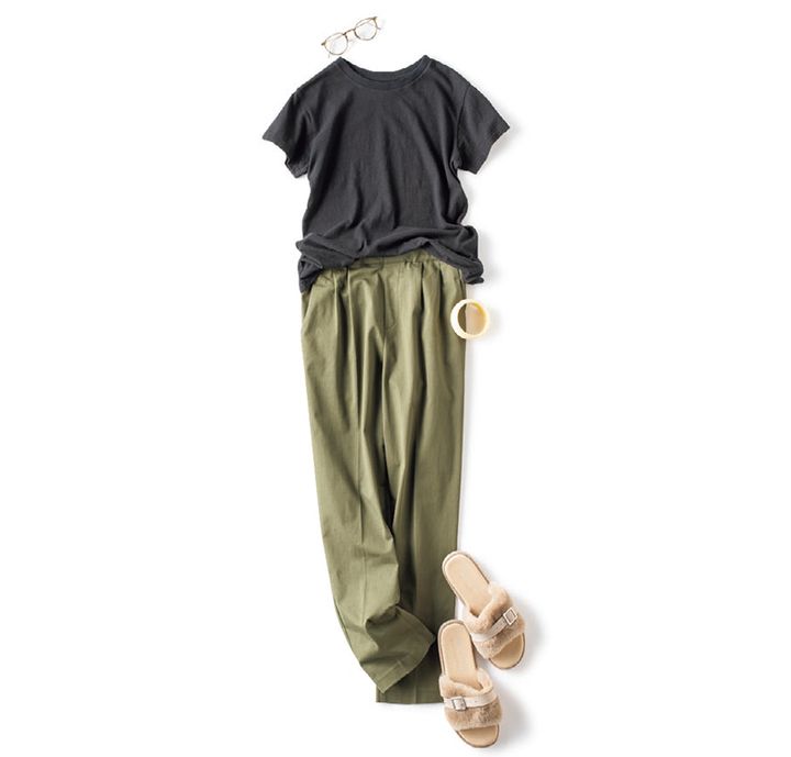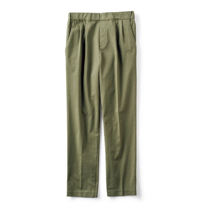 ニュアンスカラーのカーキをワードローブに入れるとぐんとこなれ感が高まります。テーパードパンツ¥2,990(イマージュ/セシール)