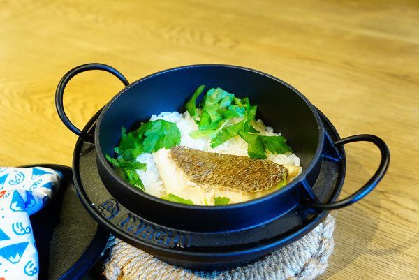 「名物 鯛めし」(2合 1,899円、4合 2,309円)は、南部鉄器の鉄釜で炊き上げていて、お米にもこだわり、石川県のブランド米「ひゃくまん穀」を使用。粒感と粘りのバランスがとれ、味わいも食感も抜群。 風味良く、程よい粒食感がなんとも美味でご飯好きにはうれしい一品。お酒好きな人には〆として、お酒があまり飲めない人でも、鯛めしと炉端焼きの野菜や魚で満足なお食事になりそうです。