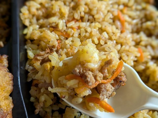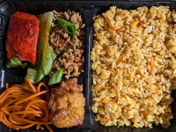 今回は、水曜日限定の「スリランカチャーハン弁当」をいただいてみることにしました。左上から時計回りに「タンドリーチキン」「キーマスパイシー」「スリランカチャーハン」「から揚げ」「スパイシーパスタ」です。
