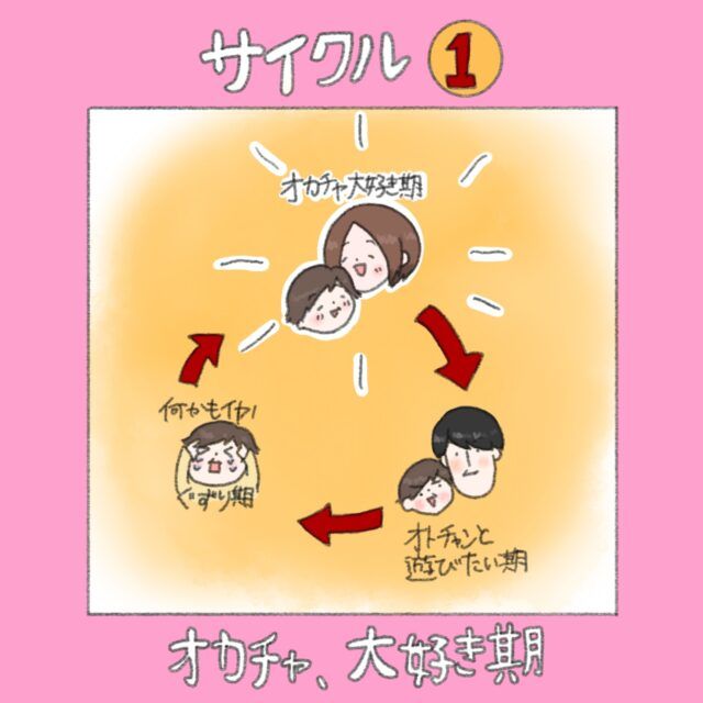 2歳みぃくんのイヤイヤ期には「ママ大好き期」、「パパと遊びたい期」、「何もかもイヤなぐずり期」の3つのサイクルがあるのではないかと気付いたねむりひつじさん。まずは、1つ目のサイクル「ママ大好き期」についてです。