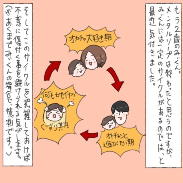 2歳の男の子みぃくんのお母ちゃんであるねむりひつじさんから、みぃくんのサイクルのお話です。イヤイヤ期に入ったみぃくんをよくよく観察してみたねむりひつじさんは、みぃくんのイヤイヤ期にはサイクルがあることに気づいたそう。どんなサイクルなのでしょうか?