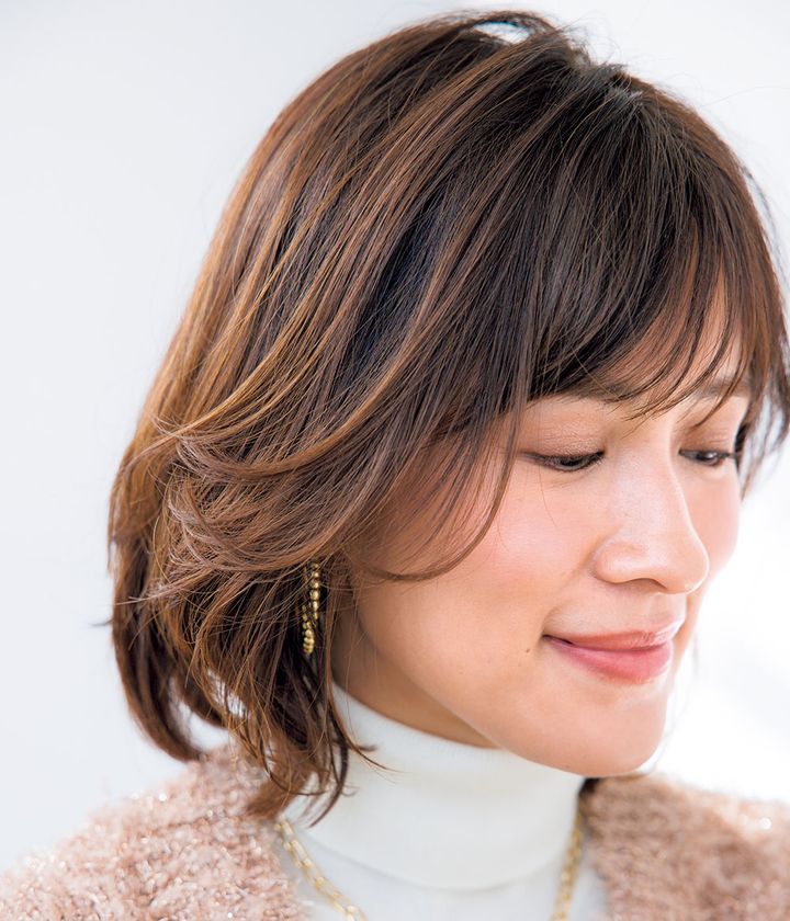 顔周りと前髪のニュアンスで輪郭がキュッと見えます。