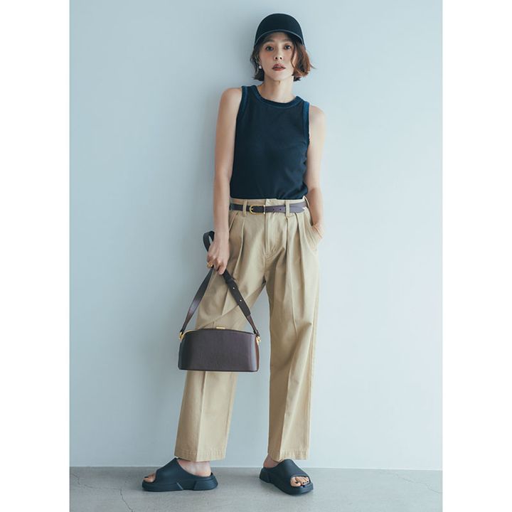 ウールキャップ¥17,600(IRIS47/フーブス)タンクトップ¥3,980(オペーク ドット クリップ)サンダル¥10,780(Paes/ロースバッド ルミネエスト新宿店)チノパンツ¥13,200(ジーンズファクトリークローズ/ジーンズファクトリー 卸団地本店)ピアス¥15,400リング¥12,100(ともにシトラリー)ブレスレット¥162,800(ジジ/ホワイトオフィス)バッグ¥61,600(ニューイ/ショールーム ロイト)ベルト¥12,100(レフィエ/アンタイトル)