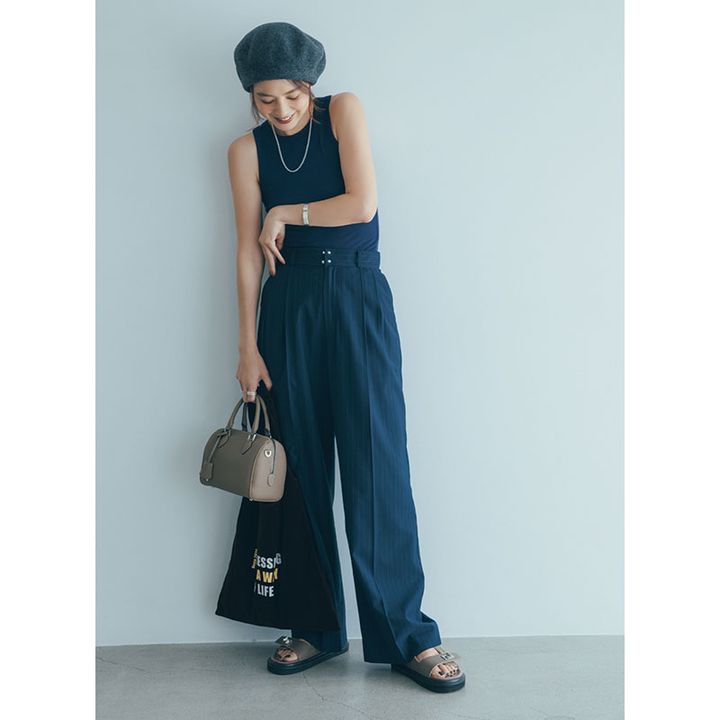 ベレー帽¥6,600(CA4LA/CA4LA プレスルーム)タンクトップ¥13,200(ボーダーズ アット バルコニー)サンダル¥48,400(ピッピシック)パンツ¥13,750(レイ ビームス/レイ ビームス 新宿)ピアス¥18,700リング[太]¥15,950リング[細]¥7,700(すべてココシュニック オンキッチュ/ココシュニック)ネックレス¥35,200(ブランイリス/ブランイリス トーキョー)バングル¥55,000(ニナ・エ・ジュール/ショールームロイト)バッグ¥209,000(ボナベンチュラ)トートバッグ¥13,200(ハァウ/ウィム ガゼット 青山店)