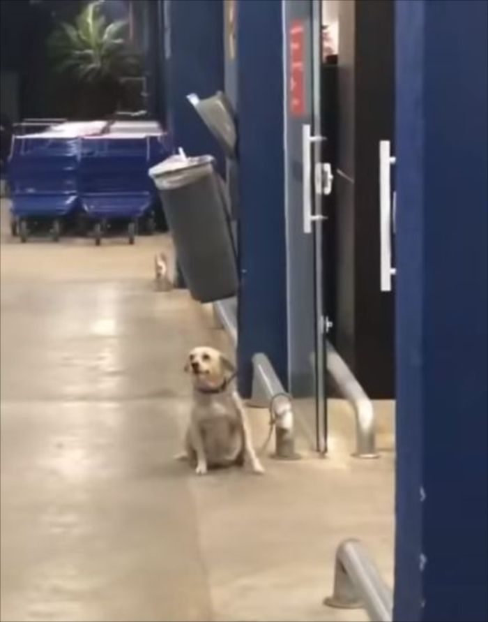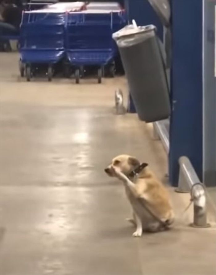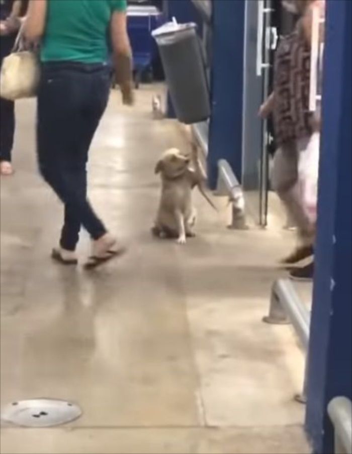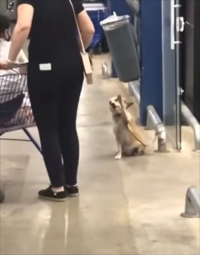 スーパーの出入口に座り込んでいた犬。 飼い主さんが戻って来るのをおとなしく待っているのかと思いきや・・・お店から出てくる買い物客たちにあるアクションと取っていました!!