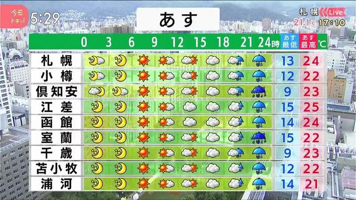 あす14日(土)の時間ごとの天気。道央・道南からです。