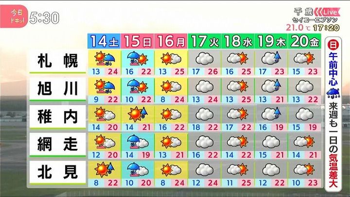 札幌は13日まで39日連続で、最高気温が25度以上の夏日となっていますが、あす14日(土)でその連続日数が途切れそうです。