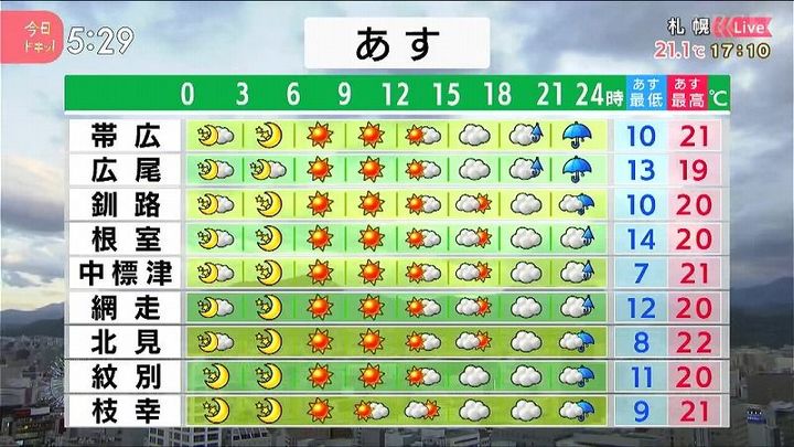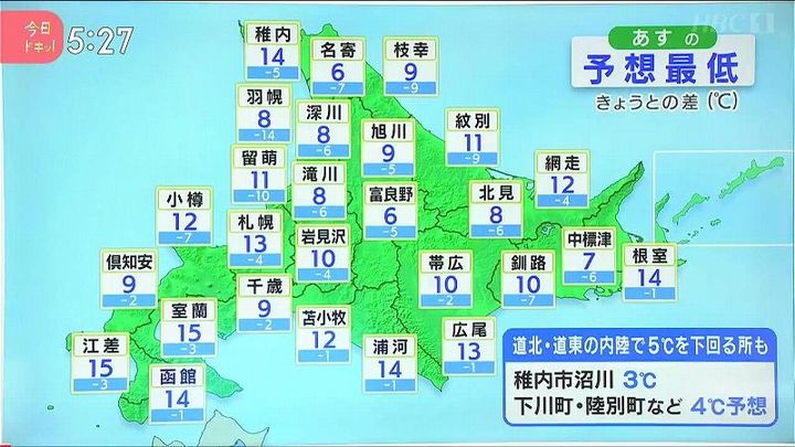 稚内市沼川や下川町、陸別町などでは5度を下回る可能性があります。