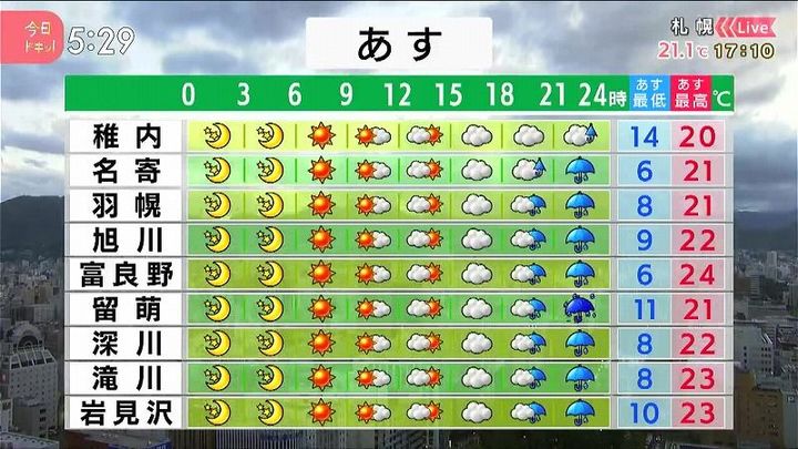 内陸は広く一桁で、旭川9度、北見8度、名寄や富良野も6度まで下がる予想です。