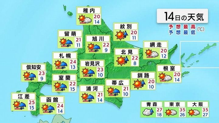 北海道のあす14日(土)からの天気予報とポイントを、HBCウェザーセンターの星井さき気象予報士がお届けします。