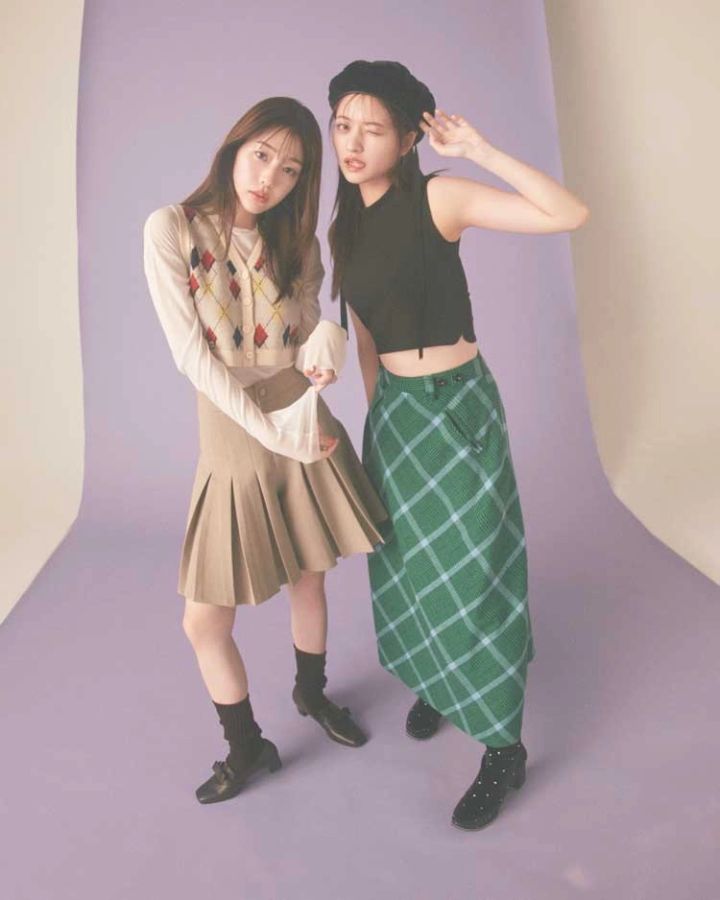 〈左・里帆〉アーガイルベスト 20,000円、カーキスカートパンツ 11,000円/ともにseooocookie シアートップ 5,500円/オー・ゼロ・ユー(アドアーリンク) ソックス 2,189円/ビームス ボーイ(ビームスボーイ 原宿) ローファー 9,900円/RANDA〈右・紗耶〉グリーンチェックスカート 18,480円/ビームス ボーイ(ビームス ボーイ 原宿) 黒プチハイネックトップス 4,290円/EMODA ルミネエスト新宿店 ベレー帽 14,300円/CA4LA ロングブーツ 36,850円/ダイアナ(ダイアナ 銀座本店)
