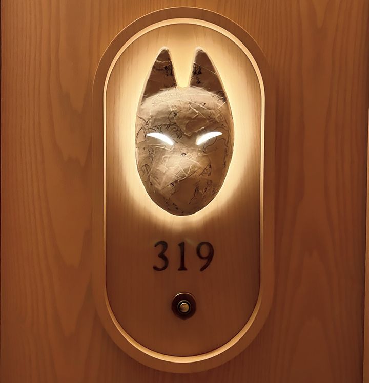 ドア横の客室番号は再生和紙を使ったキツネのお面で、“Don’t disturb”にしたい時は眼の灯りを消すという遊び心もある。