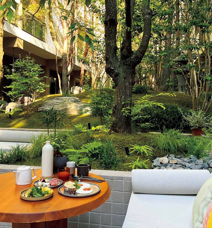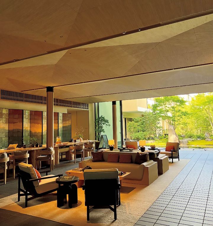 ホテル前は大通りにして、「シックスセンシズ 京都」に入れば、折り本のような木の天井を持つロビーの先に緑豊かな中庭が見え、自然を感じる。