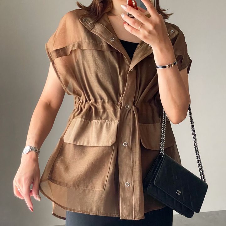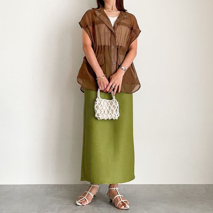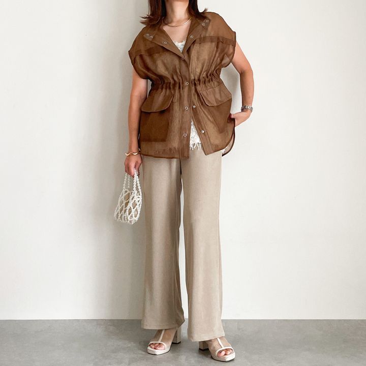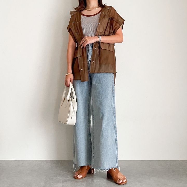 タンクトップ ✕ デニムパンツのシンプルな合わせ方も、オーガンジーベストを羽織るだけで一気にこなれた印象に。 ベストとタンクトップの色味を合わせて、ちょっぴり秋を意識!