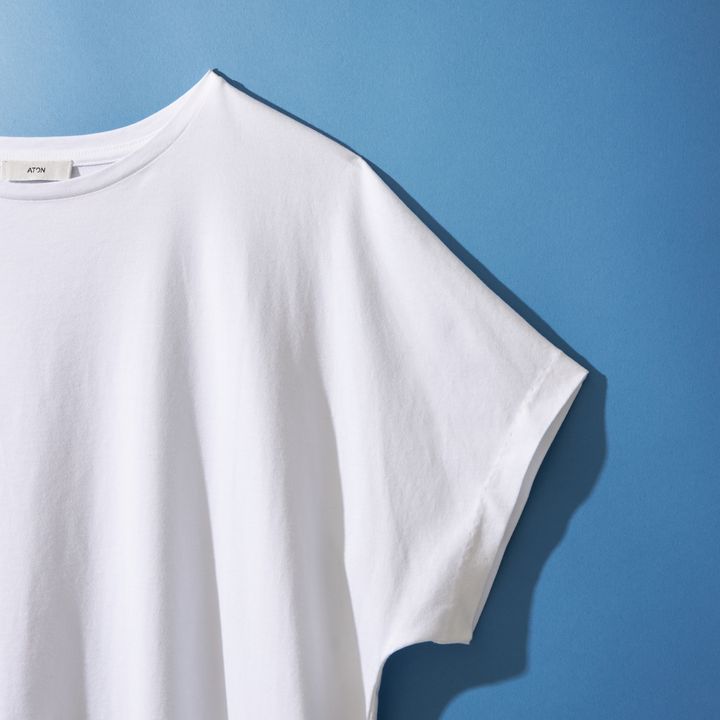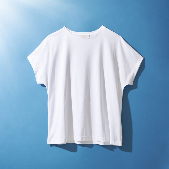 きれい見え白Tのポイントをしっかり押さえたアイテム1点目は、ATONのもの。なめらかな生地を使用しているので、着用すると柔らかなニュアンスになり脱カジュアル。ステッチを排除したデザインで、Tシャツながらミニマムな大人っぽさを実現。肩から袖にかけてはゆったりしているので二の腕もさらりとカバーしてくれます。Tシャツ¥14,300(ATON)