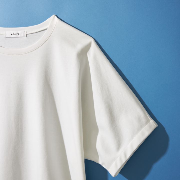 チームVERYの愛用者も多いエブールの名品Tシャツ。こちらもキレイ見えTシャツの3つのポイントを完備。ハリがあり、体のラインを拾いすぎないことで美しく見せてくれるので、クローゼットにあると重宝します。カットソー¥12,100(ebure/LITTLE LEAGUE INC.)