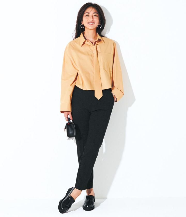 パンツ¥18,700(ルーニィ)タイ付きシャツ¥10,450(Mila Owen)バッグ¥14,300(ダイアナ/ダイアナ 銀座本店)ローファー¥9,350(ラルート/アバハウスインターナショナル オンラインストア)ピアス¥10,450〈フルトクイスト・コペンハーゲン〉ブレスレット¥73,040〈バルブス〉(ともにZUTTOHOLIC)リング¥39,600(ガルニ/ガルニトウキョウ)