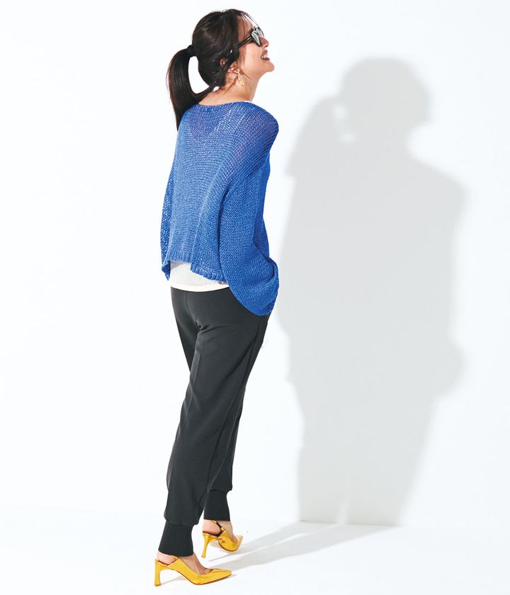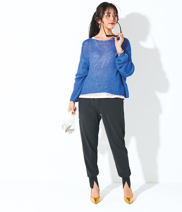 パンツ¥7,990(アンフィーロ)ニット¥8,800(アパートバイ/アダストリア)スパンコールタンクトップ¥30,800(エストネーション/エストネーション)バッグ¥3,960(THIRD MAGAZINE)パンプス¥36,300(PIPPICHIC/ベイジュ)サングラス¥47,410(オリバーピープルズ/ルックスオティカジャパン カスタマーサービス)ピアス¥28,270(ベン・アムン/ZUTTOHOLIC)バングル¥25,300(ワンエーアールバイウノアエレ/ウノアエレ ジャパン)