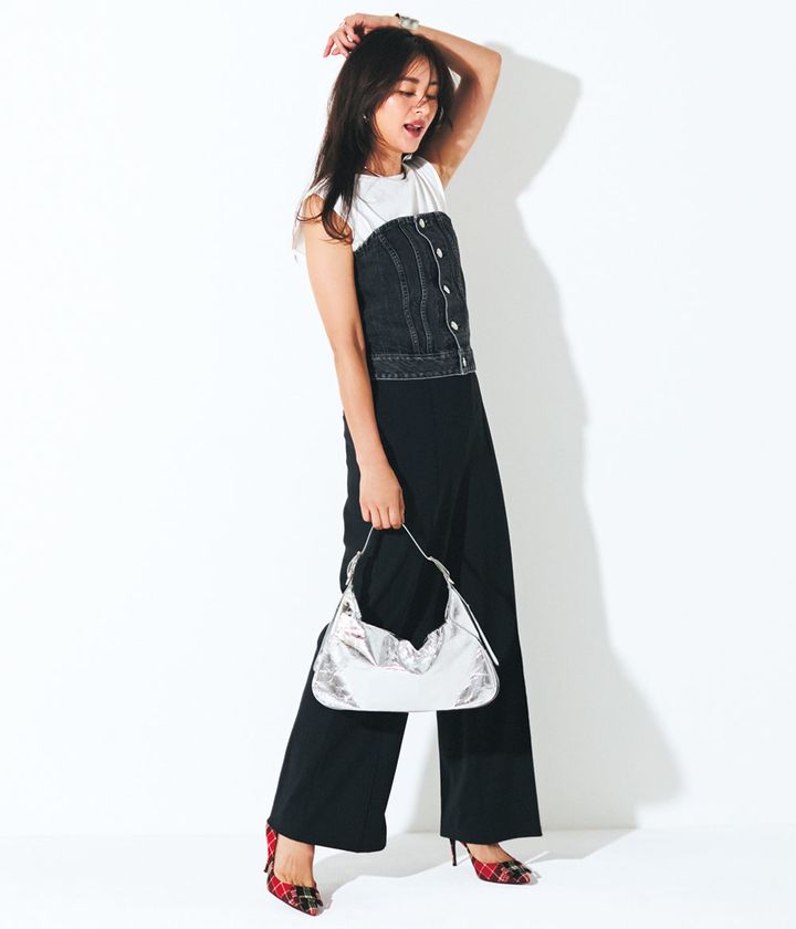 パンツ¥12,000(PLST)カットソー¥5,390(ビーミング by ビームス/ビーミング ライフストア by ビームス ららぽーとTOKYO-BAY店)ビスチェ¥28,600(ハイク/ボウルズ)バッグ¥6,490(カシュカシュ/アンビリオン)パンプス¥31,900(ツル バイ マリコ オイカワ)ピアス¥41,800ネックレス¥38,500(ともにウノアエレシルバーコレクション/ウノアエレ ジャパン)バングル¥41,580(ソコ/ZUTTOHOLIC)