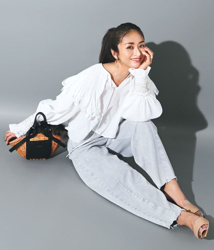 デニムパンツ¥17,600(カデュネ)ブラウス¥22,000(ジャーナル スタンダード/ジャーナル スタンダード 自由が丘店)バッグ¥30,800(ヴィオラドーロ/ピーチ)フラットシューズ¥31,900(PIPPICHIC/ベイジュ)ピアス¥18,700リング¥15,400(ともにアルティーダ ウード)