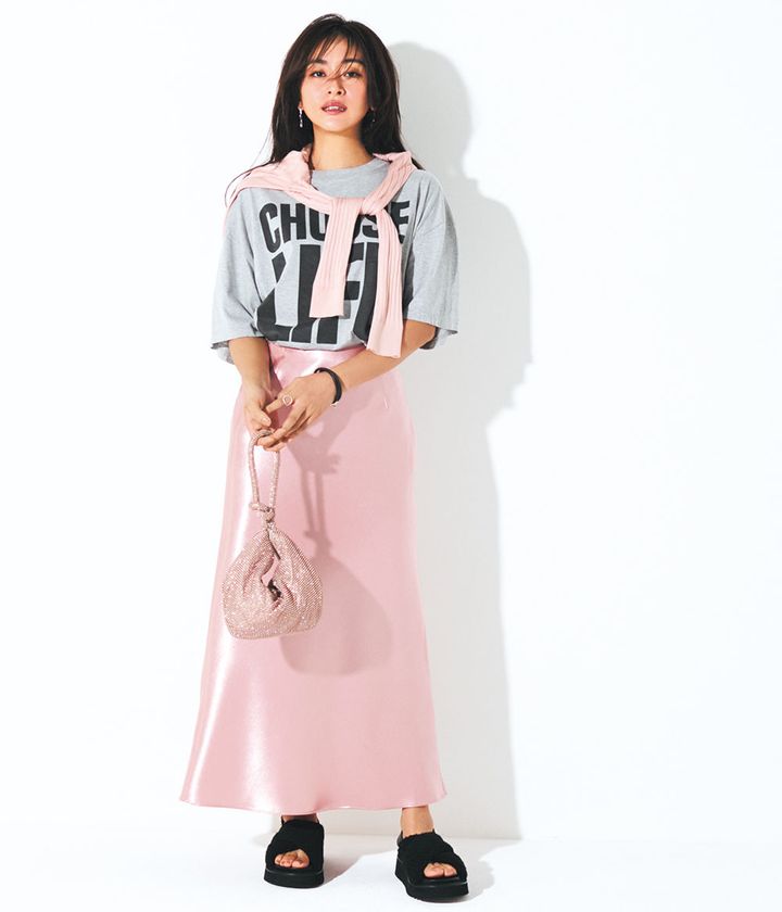 スカート¥16,500(アルページュストーリー オリジナル)Tシャツ¥15,400(THIRD MAGAZINE × mikomori × KATHARINE HAMNETT/THIRD MAGAZINE)カーディガン¥37,400(スローン/ザ ショップ スローン 新静岡セノバ店)バッグ¥8,690(カシュカシュ/アンビリオン)サンダル¥53,900(サクラ/インターリブ)ピアス¥22,000(マリハ)ブレスレット¥39,600(ガルニ/ガルニトウキョウ)リング¥12,100(アルティーダ ウード)