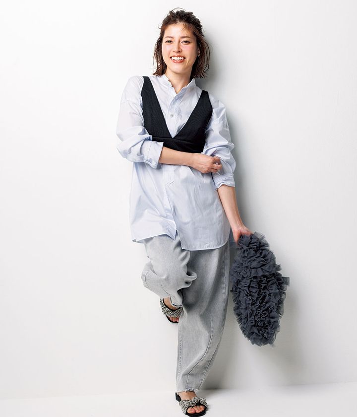 ビスチェ¥18,700(ゲミニー/ウィム ガゼット 玉川髙島屋S・C店)シャツ¥26,400(ティッカ)パンツ¥17,600(カデュネ)バッグ¥6,600(ル タロン/ル タロン 有楽町マルイ店)サンダル¥130,900(セルジオ ロッシ/セルジオ ロッシ カスタマーサービス)ピアス¥22,000(カラ・ユ/ショールーム ロイト)