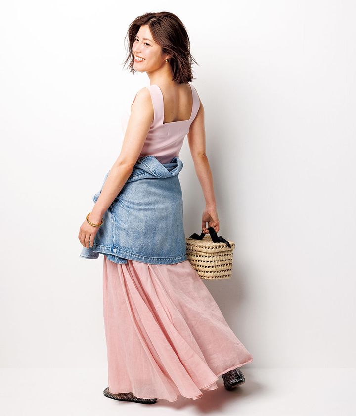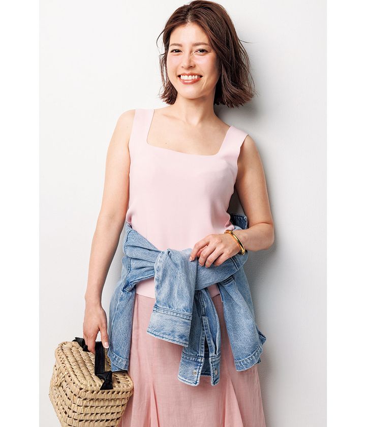「そろそろ大人も取り入れていいトレンドとして定着しつつある、ブラ型ビスチェ。Tシャツやシャツに重ねることで、上半身にポイントが作れるSサイズの味方。下着見えしないシンプルなデザインを選ぶのも鉄則。」(神田さん)