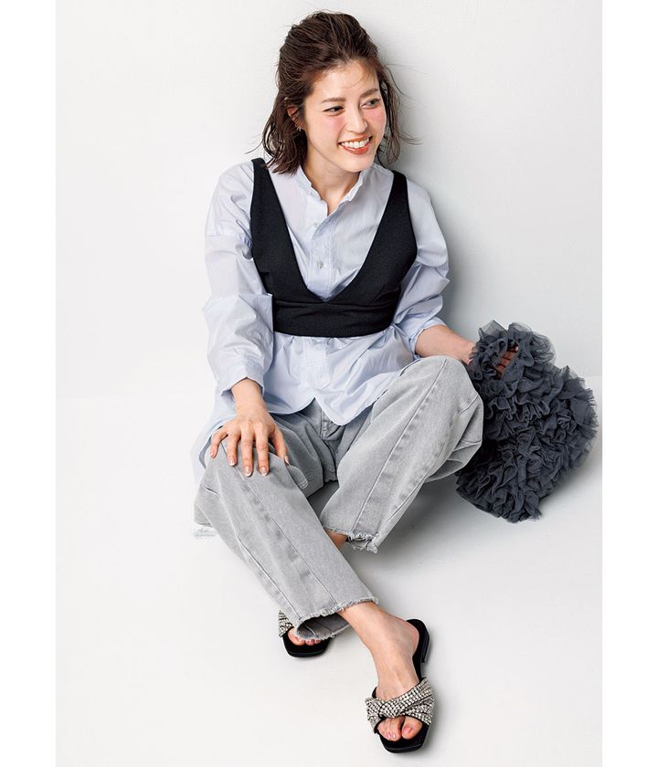 オーバーシャツ×ゆるデニムもビスチェのおかげで締まって見えてバランスアップ。黒に頼れば、ブラ型ビスチェも大人顔。