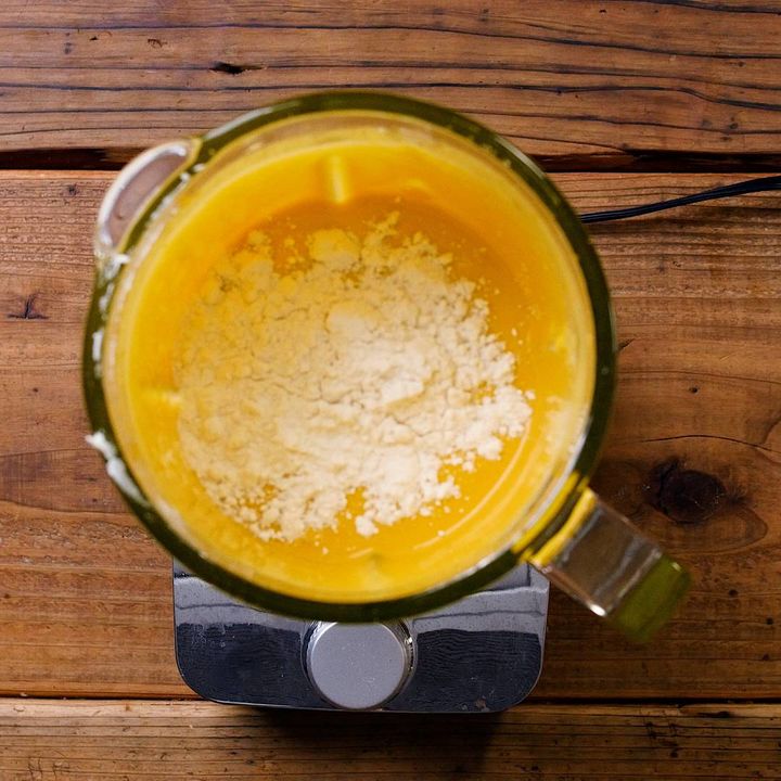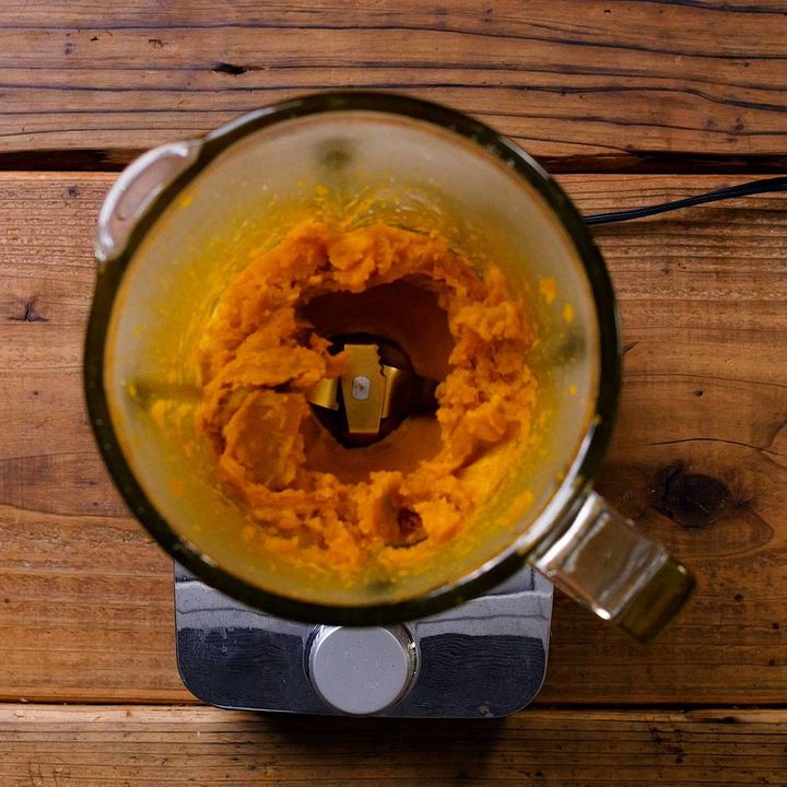 4: ミキサーまたはフードプロセッサーに③、牛乳の半量を加えてペースト状になるまで撹拌します。