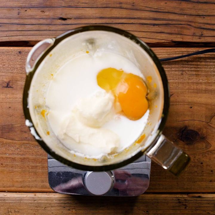 5: クリームチーズ、グラニュー糖、卵、残りの牛乳を加えてさらに攪拌します。