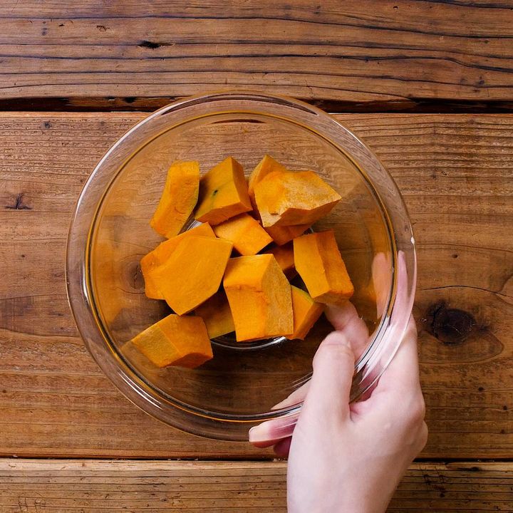 3: ボウルにかぼちゃを入れてふんわりラップをかけ、レンジ600Wで5分加熱します。