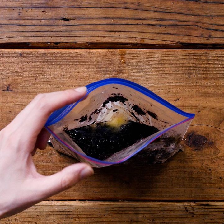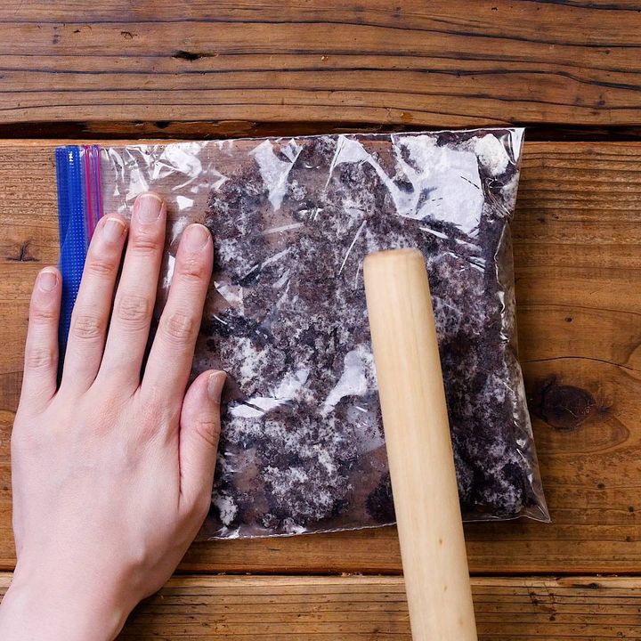 1: ジッパー付き保存袋にビスケットを入れ、めん棒で叩いて砕きます。