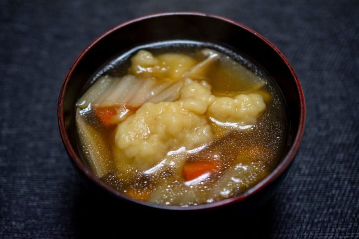 「水団(すいとん)」は、小麦粉を水でこねて一口大にした生地を、汁に入れて煮た食べ物。 野菜などと一緒に、味噌汁や醤油・出汁を混ぜた汁に入れられた後、煮込んで食べられています。