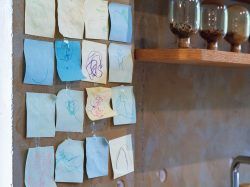 「お店に子どもたちが遊びに来たときに、描いた絵を貼っています」
