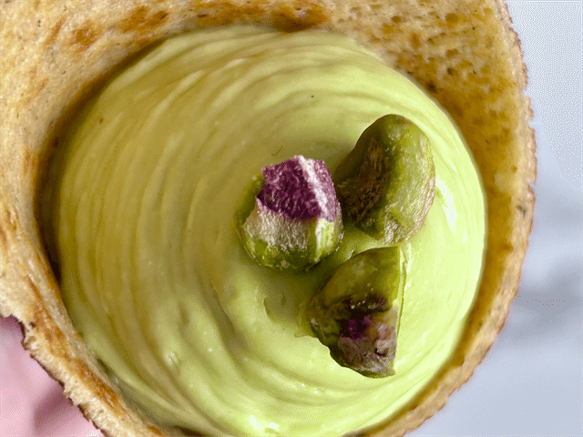 なめらかなピスタチオクリームの上には、ゴロッとしたピスタチオがのっています。一口目からピスタチオの風味や香りがたっぷり。