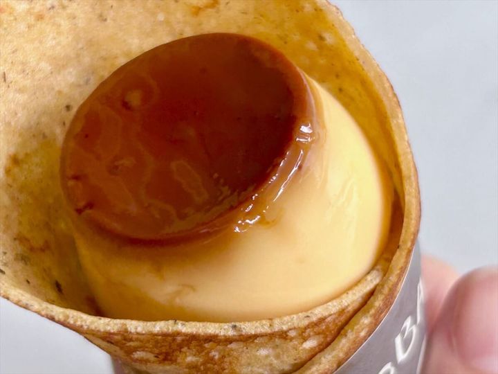 たまご感をしっかりと感じられる濃厚な味わいのプリンを食べ進めると、中にはクリームとキャラメルベリーソース、メレンゲが入っていました。