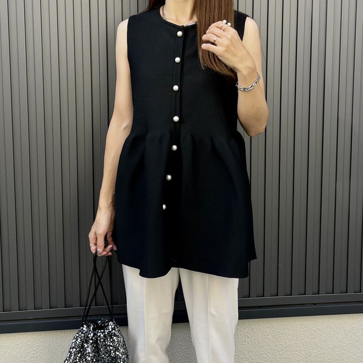 フレアの裾にパールボタンが可愛いベスト。 今の時期にぴったりなんです!