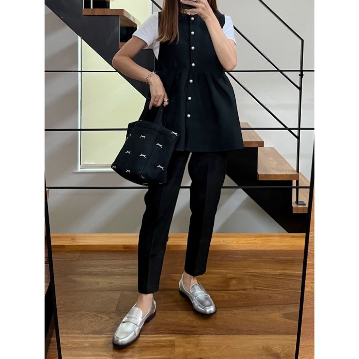ブラックのテーパードパンツを合わせることで、セットアップ風コーデの完成です! 幼稚園や学校行事にもよさそうです♪