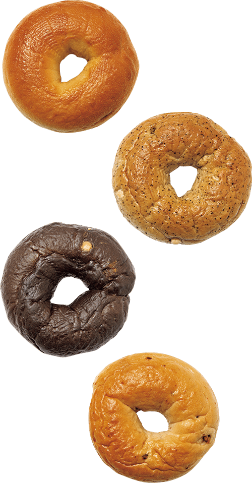 上から:ベーグル プレーン¥216、同 アールグレイミルクティー、同 ココアホワイトチョコ、同 メープルウォルナッツ 各¥259