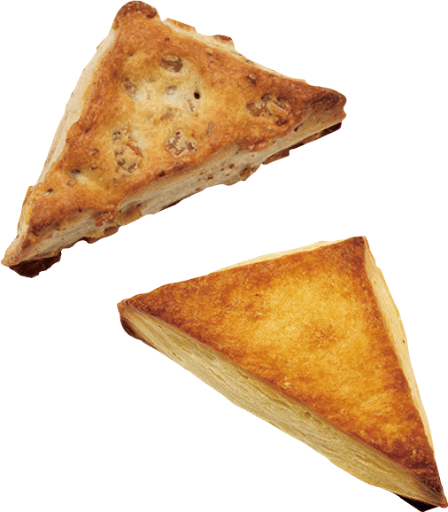 北海道産の乳脂肪47%の生クリームと牛乳で仕込み、歯切れのよいしっとりとした食感に仕上げたスコーン。甘いジャムにも、シャルキュトリにも合うプレーンはもちろん、アメリカ産の香ばしいくるみを混ぜ込んだタイプもあります。