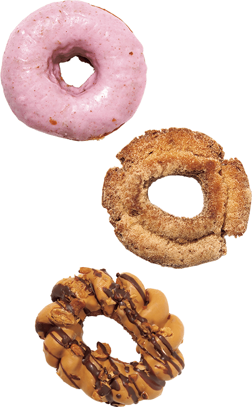 上から:ドーナツ いちごチョコレート ¥228、ローストナッツクランチキャラメルチョコ、オールドファッション 大浜大豆きな粉 各¥291