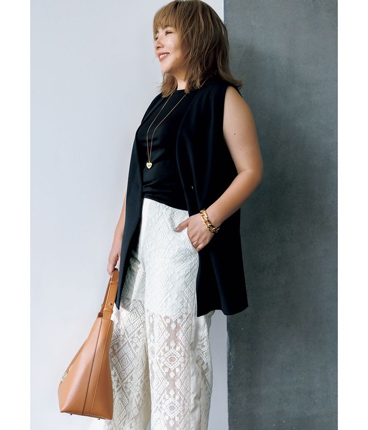 ジレ¥9,990(アンフィーロ)タンクトップ¥5,390(エルーラ/アダストリア)パンツ¥29,700(アダム エ ロペ)バッグ¥58,300(フルラ/フルラ ジャパン)スニーカー¥111,100(ピエール アルディ/ピエール アルディ 東京)ピアス¥77,000(ウノアエレ/ウノアエレ ジャパン)ネックレス¥9,020(ピルグリム/ZUTTOHOLIC)ブレスレット¥37,800(アビステ)