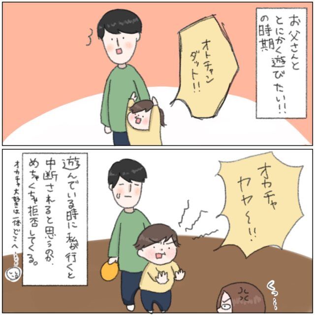ママは一緒に過ごす時間が長い分、注意することも多くなるので「パパがいい!」となったりしますよね。拒否されると悲しくなりますが、また「ママ大好き期」がやってくると思うと頑張れそうですね!