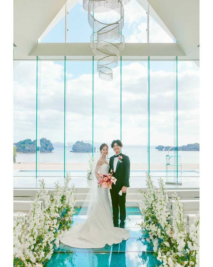 チャペルや披露宴会場からビーチが見える沖縄らしさ満点の式場。土地柄、台風や梅雨が来ない暖かい時期の4月が絶対条件でした。
