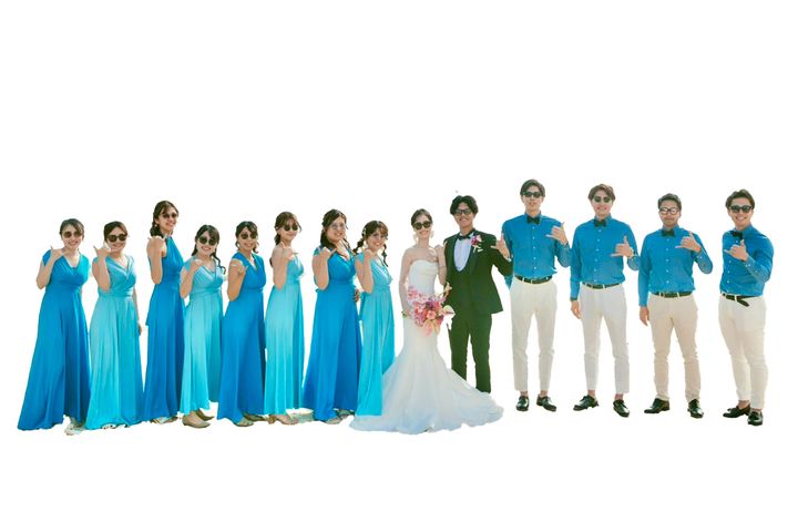 ヴェラ・ウォンのドレスが着たかったものの、レンタルはほとんど砂浜NG…諦めきれず、思い切ってアヴァとバレリーナを購入&空輸!また、ゲスト・親族には沖縄らしいブルーの衣装を約20万円かけてプレゼントしました。