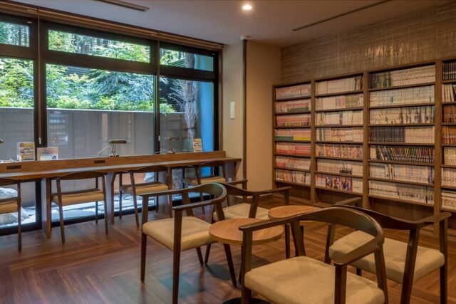 湯上り処には椅子やテーブルが置かれ、人気の漫画本など約3,000冊をそろえています。