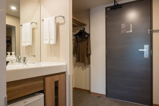 デラックスツインルームの入口付近はゆったりとした間取りで、客室とは引き戸で仕切ることができるので、洗面やシャワールームの使用時にプライバシーが守られます。広めのクローゼットも冬物の服をかけたり荷物を置くスペースとて便利です。大浴場があるのでバスタブはありませんが、シャワーブースにはベンチがついています。