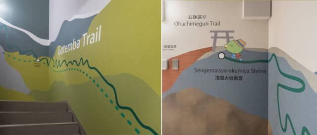 階段を1階分登る途中 Gotemba Trail(御殿場ルート)で富士登山をしているような楽しい絵が描かれています。ドーミーいんこが、富士山の火口(お鉢)を一種する “お鉢巡り” の様子も描かれていました。