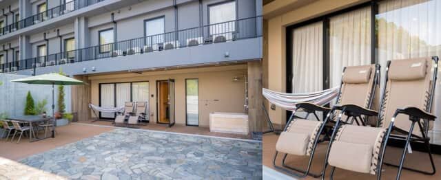 ファミリールームには車が2台停められる専用のスペースが設けられ、パラソルのついたテーブルセットやリクライニングチェア、ハンモックを設置。さらにレインシャワーを備えた檜の露天風呂が置かれます。このほかプライベートサウナのついたファミリールームも用意。ホテルステイを楽しめる客室です。