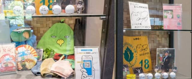 ドーミーイン(共立メンテナンス)がスポンサー企業になっている女子プロゴルファー菅沼菜々選手。ロビーのショーケースにグッズの展示が行われ、販売もしています。